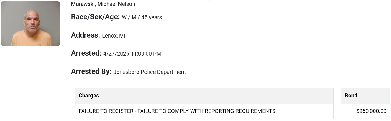 According to the probable cause affidavit, Murawski had been occupying a 2002 Silver Volvo with a Michigan license plate at the time of his arrest. Using the Flock Safety system, a network of automated license plate readers (ALPRs), police determined the vehicle had been operated in Jonesboro since April 9. Since that time, Murawski has not made any attempts to contact the Jonesboro Police Department and complete his registration as a sex offender in Arkansas.