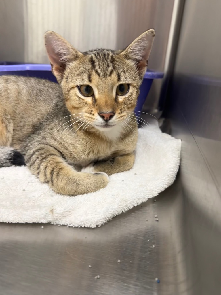 Meet Sol: Sol is an 8-month-old, domestic shorthair male cat. He came in with his litter about two weeks ago. He’s up to date on all of his vaccines, and he’s got four white “socks.” Sol is one of our favorites because he’s so affectionate and friendly!