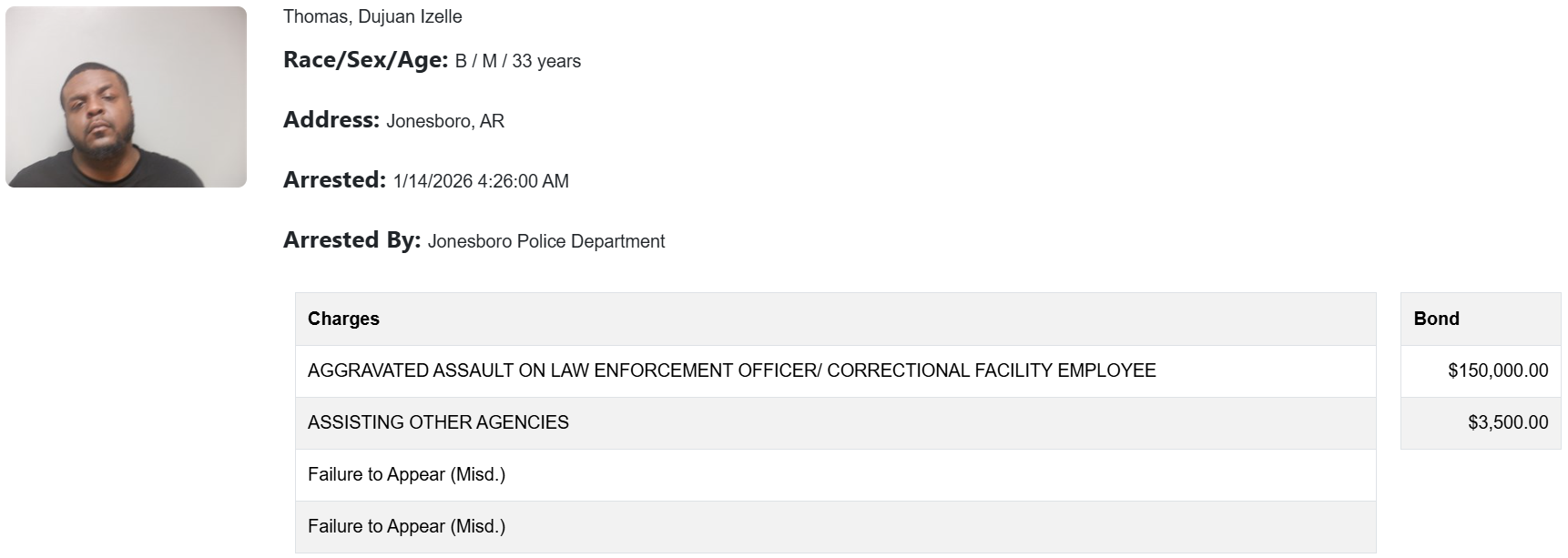 According to the affidavit, on Jan. 14, Jonesboro police officer Scott Martin saw a vehicle driven by Thomas near E. Matthews Avenue and Tony Drive and noticed the vehicle’s registration was expired. Martin attempted to stop the vehicle, but Thomas sped off.
