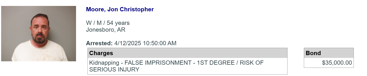 Moore was taken into custody and transported to the Craighead County Detention Center.