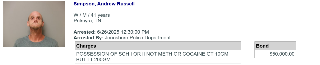 Jonesboro, AR — (JonesboroRightNow.com) — June 30, 2025 — A Tennessee man is facing multiple drug charges after police said a traffic stop in Jonesboro over an insurance violation led to officers finding several drugs, some of which were hidden in his groin area.