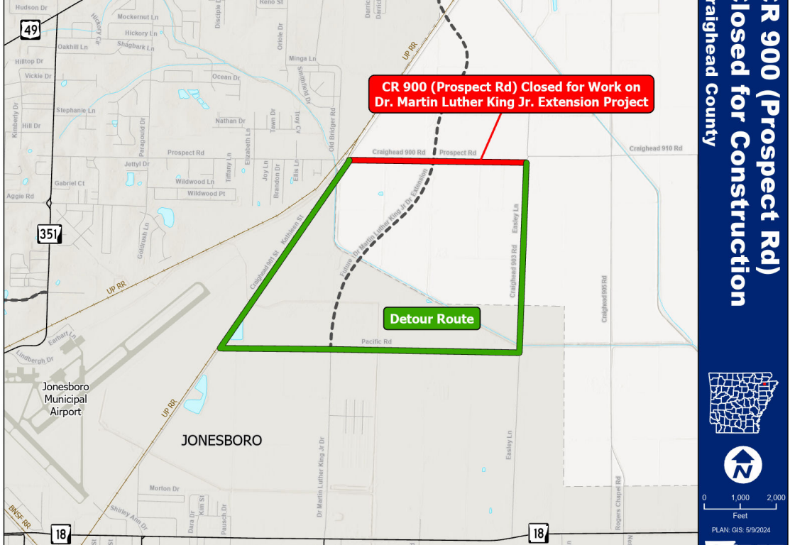 Jonesboro, AR – (JonesboroRightNow.com) – June 17, 2024 – According to ARDOT, County Road 900 (Prospect Road) will temporarily close between County Road 901 (Kathleen Street) and Easley Lane from Monday, June 17 through Friday, June 21.
