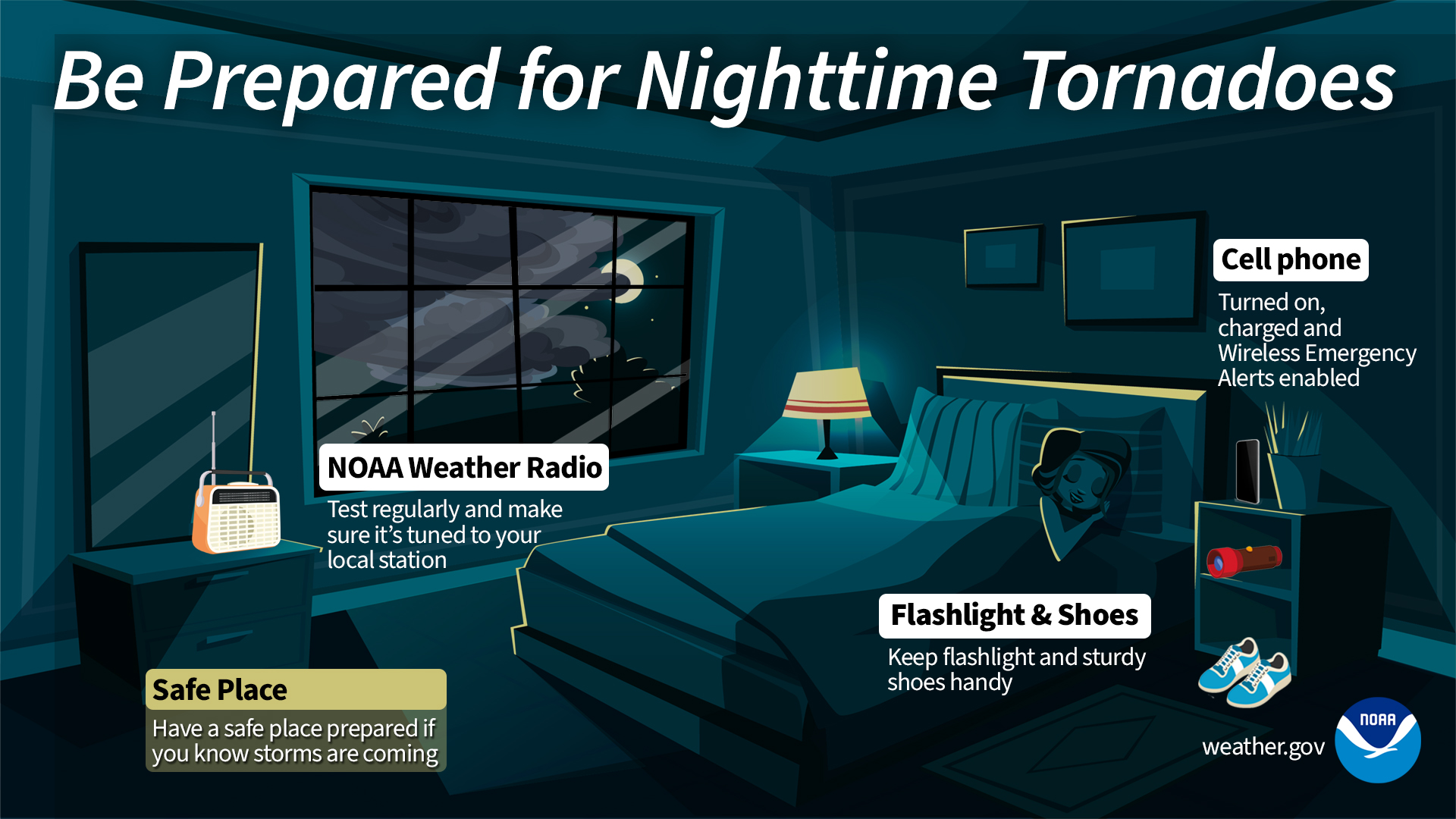 If severe weather strikes at night, keep a sturdy pair of shoes, flashlight, and radio near your bed. Make sure to have silent mode disabled on your phone so you can get alerts.