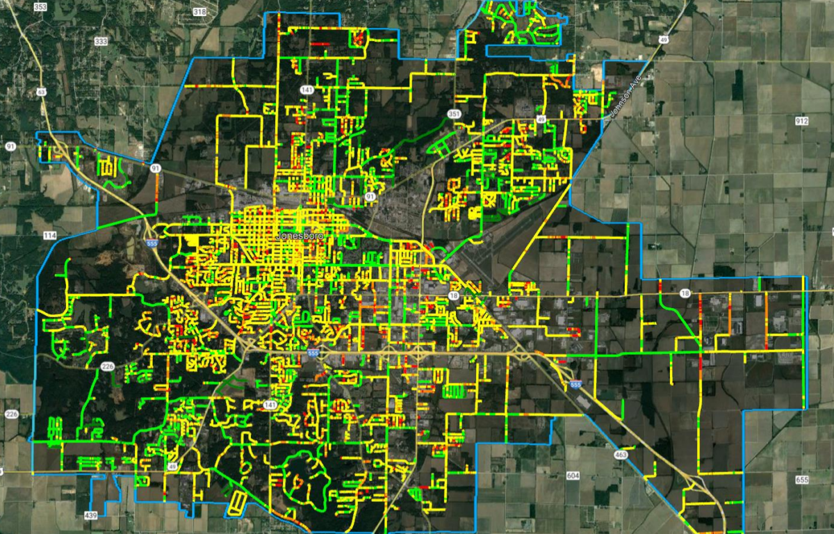 We also placed each of the roads on their list onto this map. The planned overlay projects published by the City of Jonesboro are notated by pink lines.