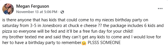 “My brother texted me and said they can’t get any kids to come, and I would love for her to have a birthday party to remember,” Ferguson wrote in her post, adding a heartfelt request: “PLSSS SOMEONE.”