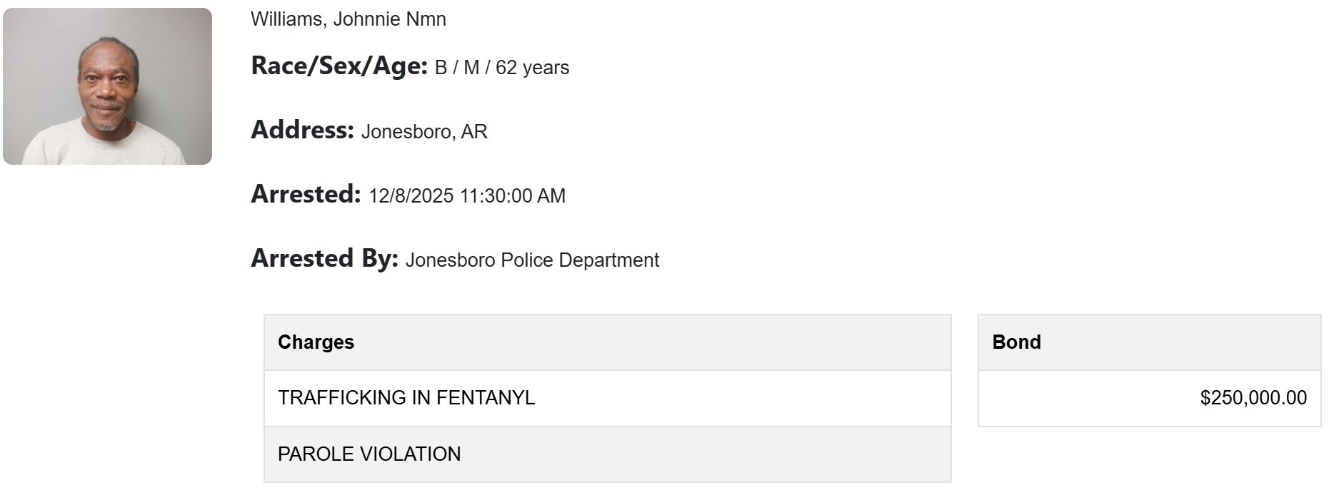 Williams is being held on a $250,000 cash/surety bond in the Craighead County Detention Center. Upon release, he must wear a GPS ankle monitor.