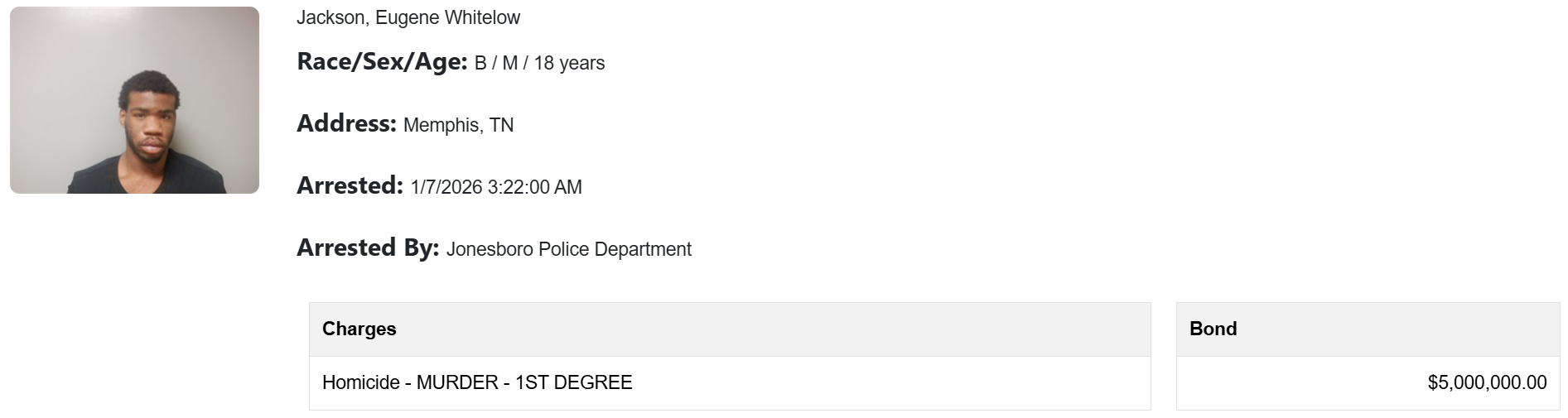 District Judge David Boling found probable cause Jan. 9 to charge 18-year-old Eugene Whitelow Jackson, of Memphis, TN, with first-degree murder (homicide), a class Y felony.