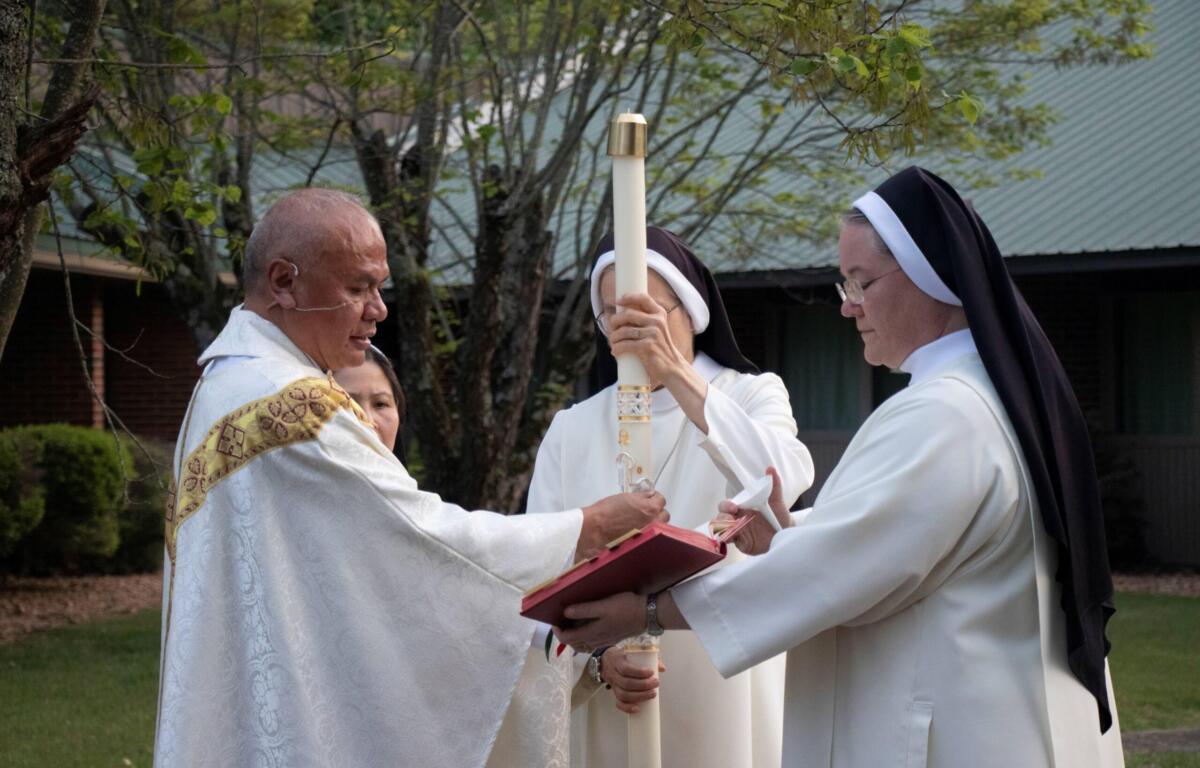 On Holy Saturday, the Easter vigil does not begin until after sunset. The service, which the Sisters start outside in the darkness, involves lighting the Easter Candle.