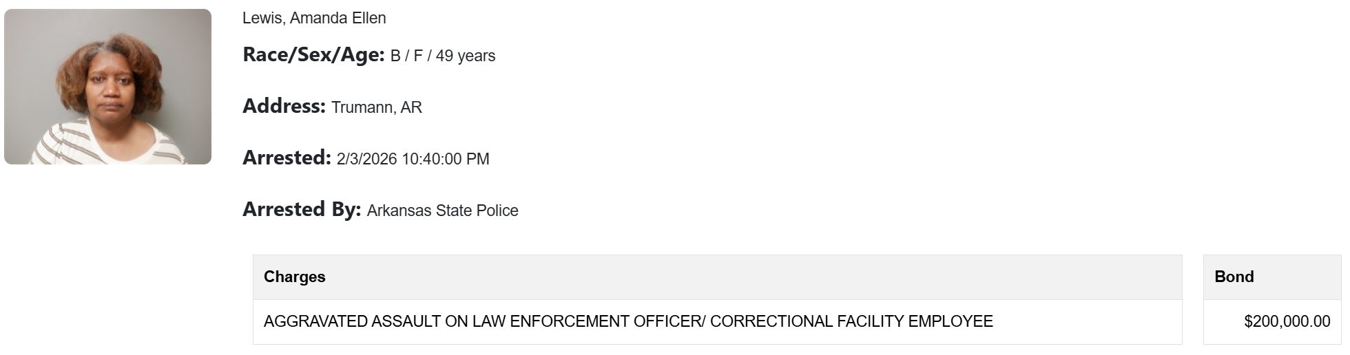 Trooper Merill joined the chase on East Nettleton Avenue, eventually executing a Tactical Vehicle Intervention (TVI) to force the vehicle to a stop. Merill said the driver, 49-year-old Amanda Ellen Lewis, had the door locked and was talking to Jonesboro dispatch but not following the officers’ commands.