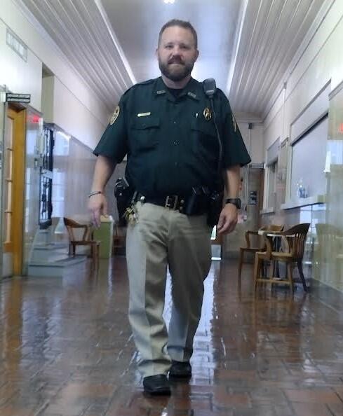 He averages walking about 6 miles a day, walking a continuous loop on the brown polished floor when he works security at the courthouse’s main entrance. He also walks on the courthouse’s third floor and crosses the walkway over Union to reach the annex building.