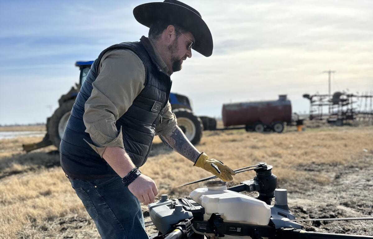 He uses a Mavic 3 drone with five camera lenses to analyze fields and then uses a computer to create a spraying “prescription.”