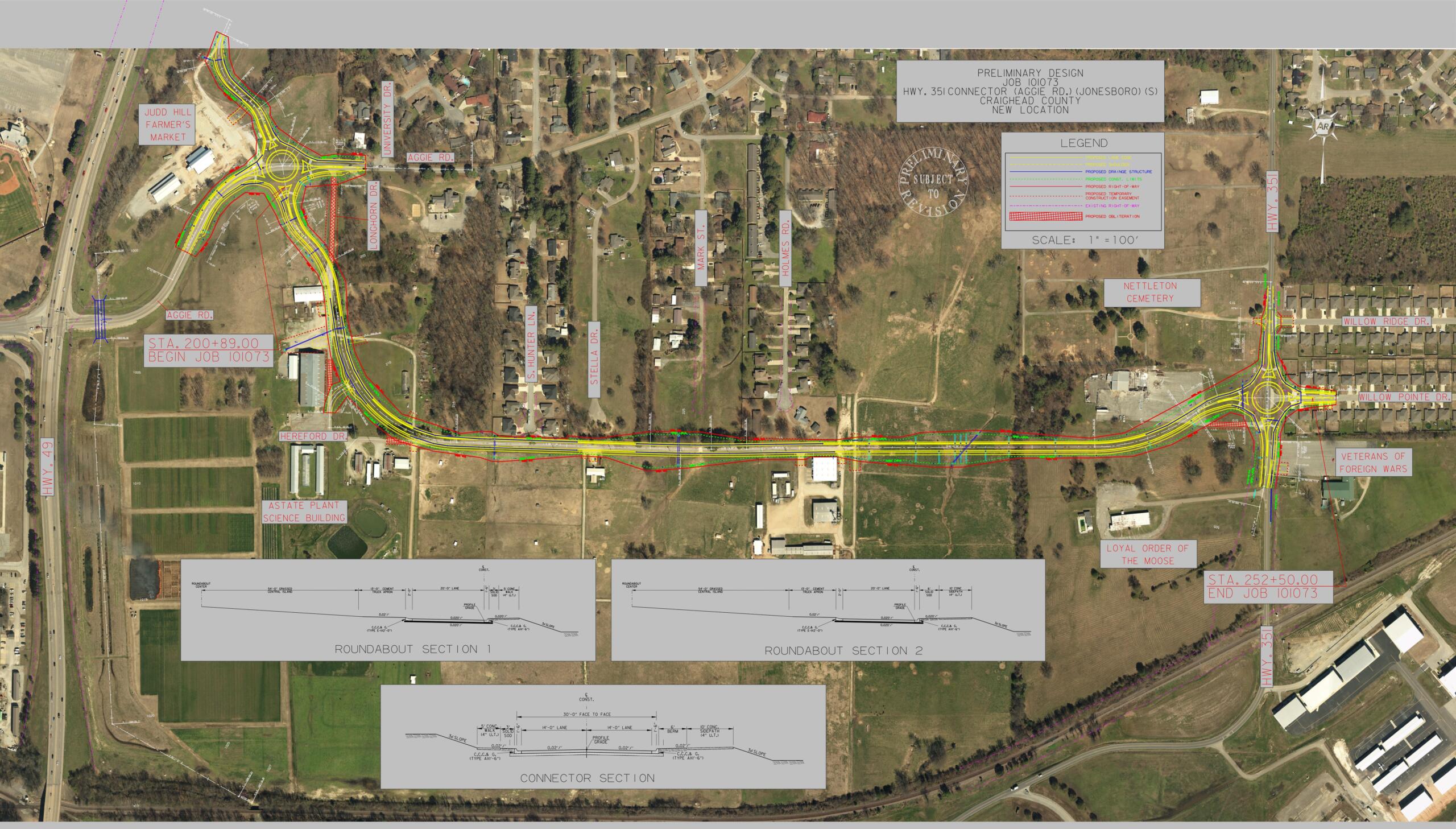 Jonesboro, AR – (JonesboroRightNow.com) – July 9, 2024 – According to documents released by ARDOT, plans for the Aggie Road/Airport Road connector includes two roundabouts, cuts through a portion of the ASU Farm and the Judd Hill Farmers Market, cuts through the old “Diamond Grill” parking lot, and seems to overlay at least 8 homes on Willow Pointe Dr.
