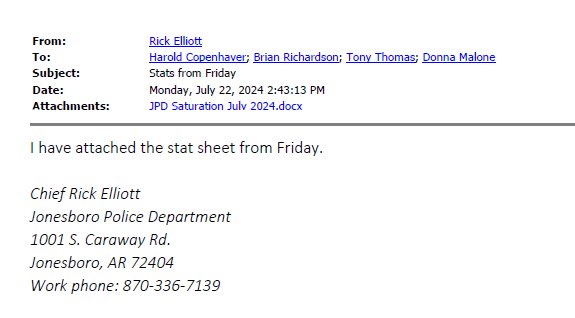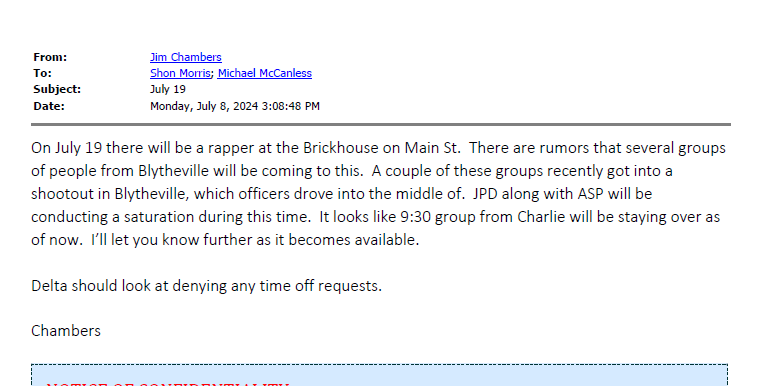 The first email mentioning the saturation came on July 8. Captain Jim Chambers sent an email to Lieutenants Shon Morris and Michael McCanless stating, “On July 19 there will be a rapper at the Brickhouse on Main St. There are rumors that several groups of people from Blytheville will be coming to this. A couple of these groups recently got into a shootout in Blytheville, which officers drove into the middle of. JPD along with ASP will be conducting a saturation during this time.”