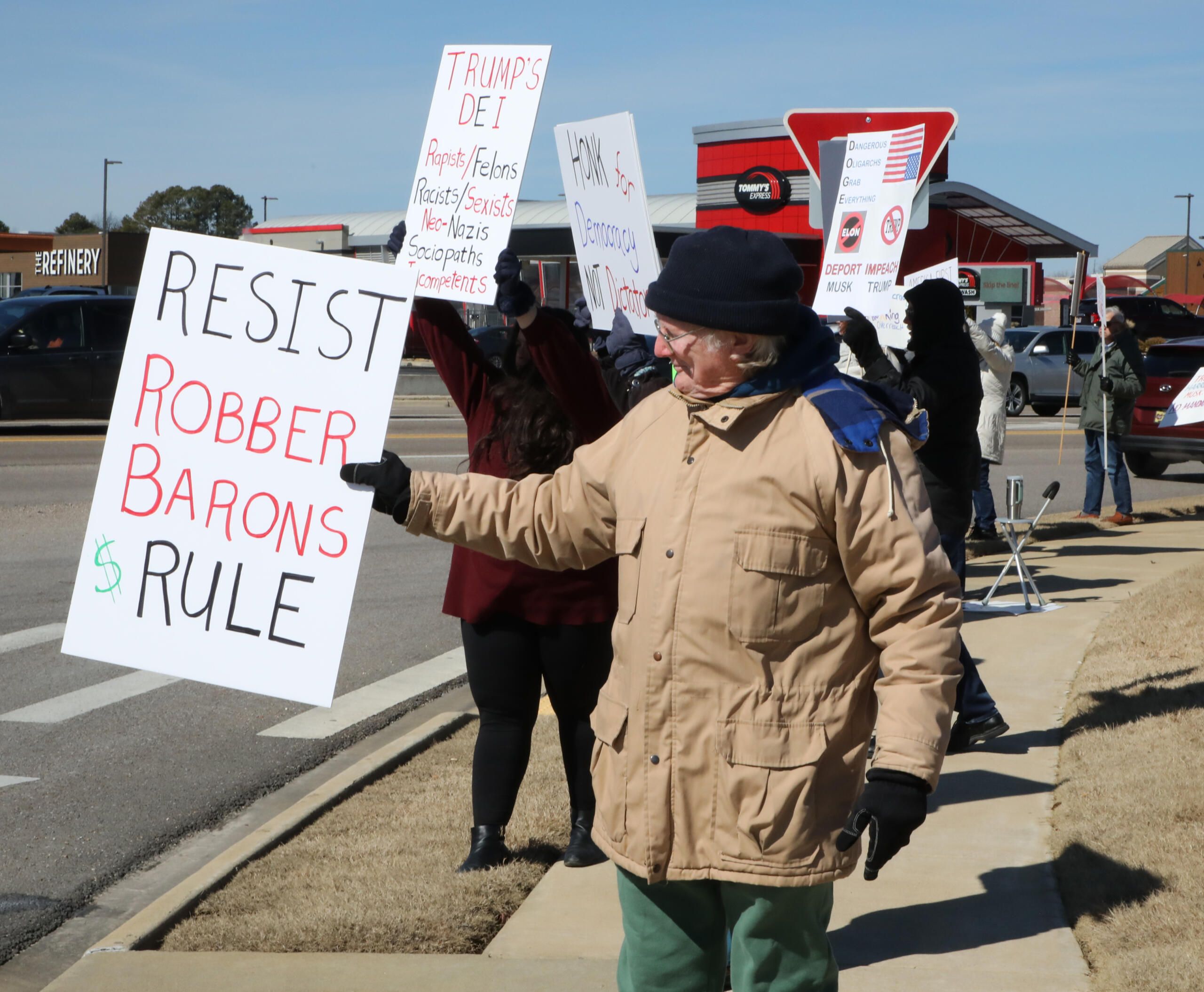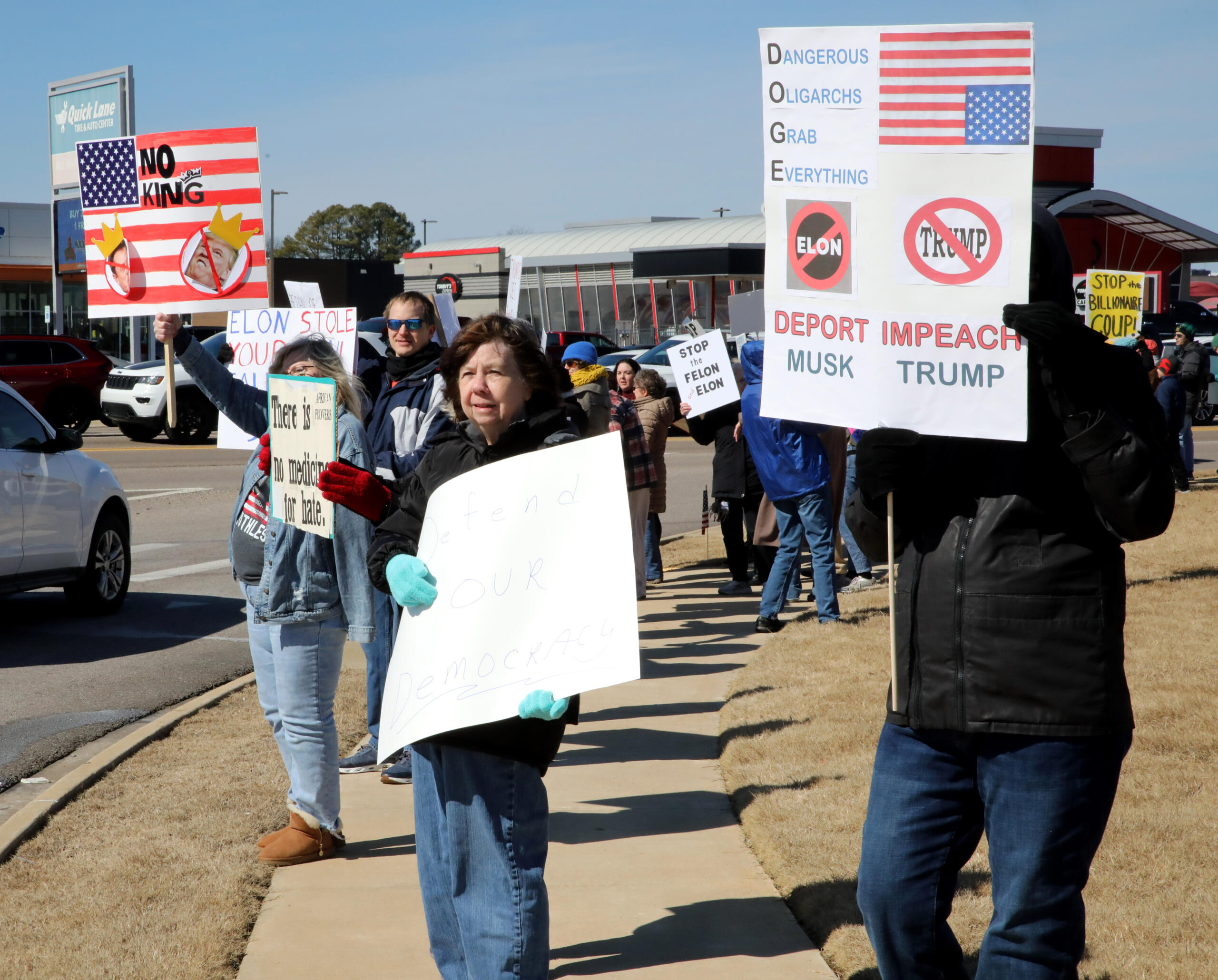 Jonesboro, AR – (JonesboroRightNow.com) – Feb. 17, 2025 – Dozens of protestors staked out on the corner of Highland Drive and Caraway Road on Monday to protest President Donald Trump’s recent executive orders, Elon Musk’s involvement in the government and more.