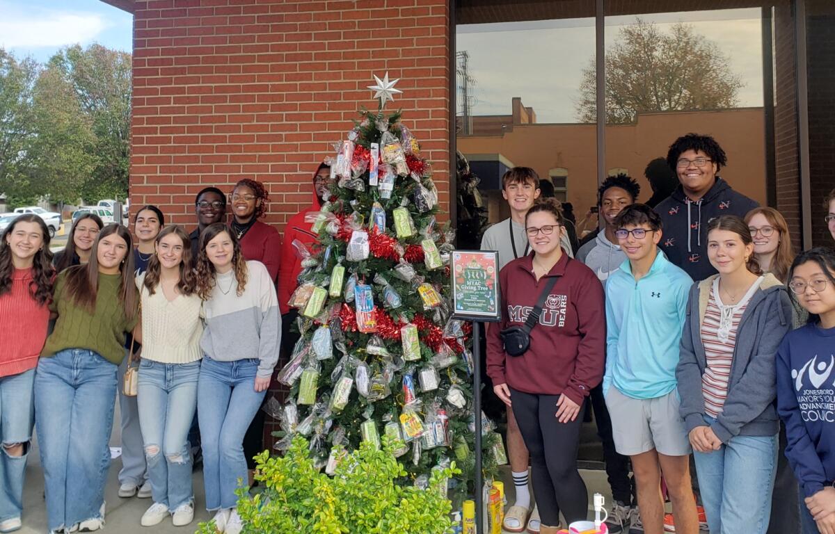 The students have already decorated the tree with items such as gloves, scarves, blankets, soap, deodorant, toothpaste and toothbrushes, shampoo, hairbrushes, wipes, feminine hygiene products and more for those in need.