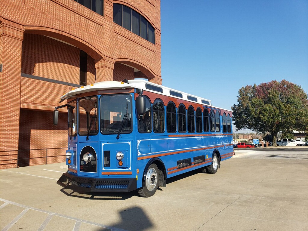 With the goal set more than two years ago to upgrade Jonesboro’s Economical Transportation System (JET), the first tangible asset in that effort arrived before dawn Monday in the form of a nostalgia- drenched shiny blue trolley bus, complete with wood interior, faux etched windows, and of course, a trolley bell.
